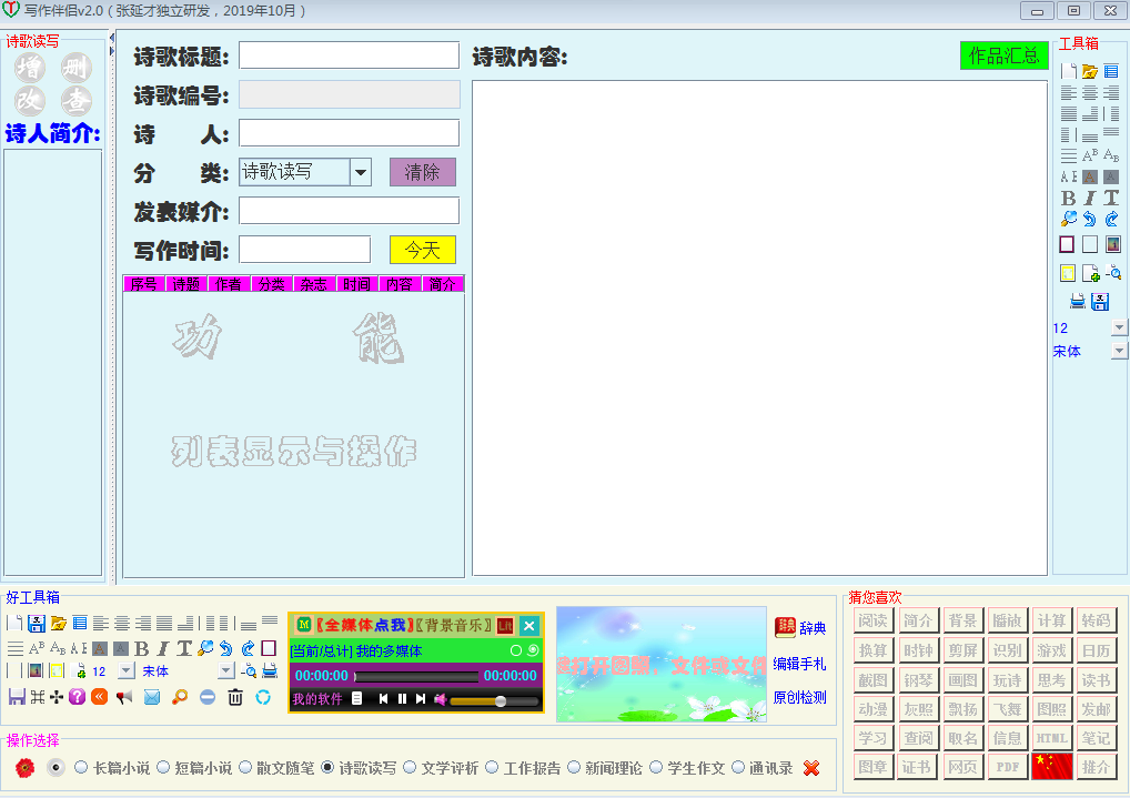 本软件经研发者张延才精心研究设计的重磅产品,给所有热爱写作的人带来福音,尤其为职业撰稿人提供极大便利。本产品核心功能为写稿、存稿、传稿、投稿、打稿、汇总、阅读、自制辞典、通讯录以及写作者窗口交流,辅以音乐、影视、动漫播放、钢琴弹奏、休闲游戏,发邮、取名、识别、截图、画图、图转换、制作图章、欣赏照片、日历、时钟、网页浏览等。稿件或用本软件平台直接录入,或从本地电脑调入,全部为数据库永久、安全保存,可存本地、上传网络,可直接以正文和附件形式直接投稿。主要功能包括正在写作、长篇小说、短篇小说、散文随笔、文学评析、工作报告、新闻理论、学生作文,显然适用作家、新闻记者、理论专家、自由撰稿人、文学爱好者以及学生等使用。